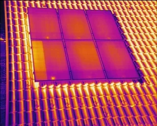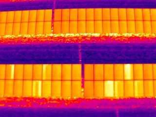 Defekte oder fehlerhafte Zellen sind mit der Wärmebildkamera deutlich sichtbar, da ihre Temperatur stark von den anderen abweicht.